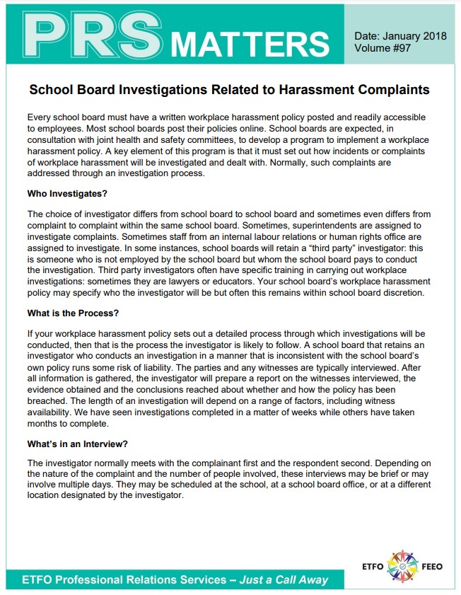 Advice – PRS Matters Bulletins Behaviour Management Training The Student Safety Plan – a working document Workplace Harassment and Sexual Harassment School Board Investigations Related to Harassment Complaints Addressing Violence in the Classroom For more PRS Matters Bulletins, click below. Read More